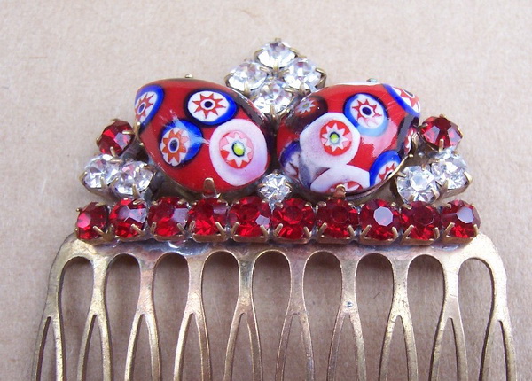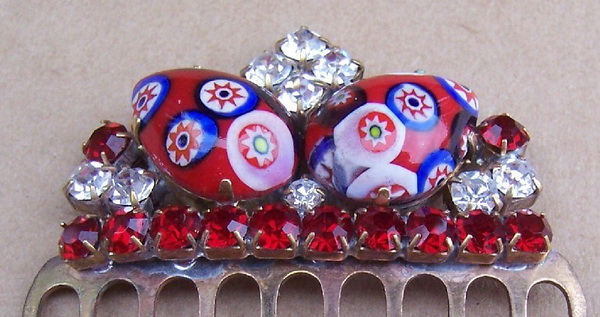 This handsome little side comb was hand made in the Czech Republic in the mid to later 20th century. It has a brass comb mount with split prongs and an elaborate heading set with two oval millefiore design cabochons. These are surrounded by red and clear prong set rhinestones.