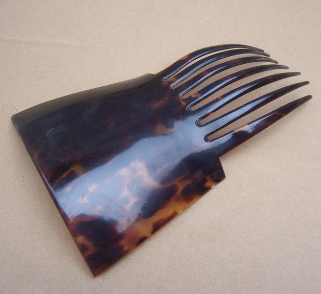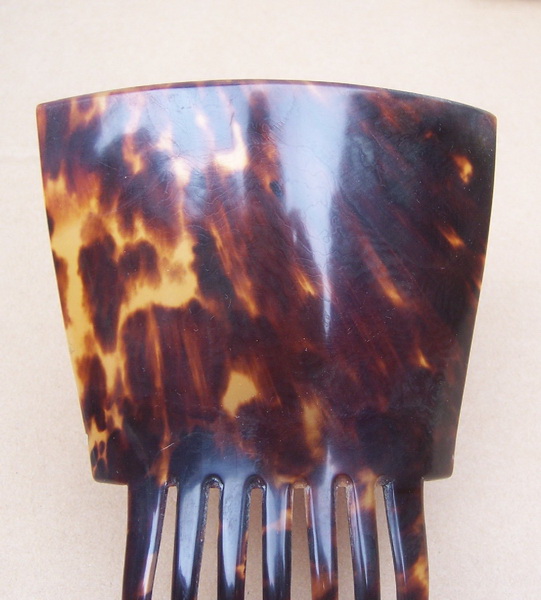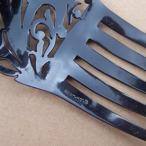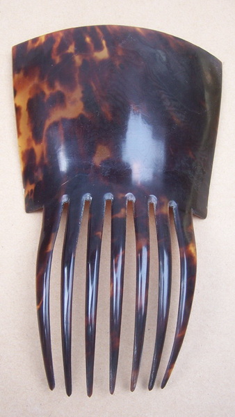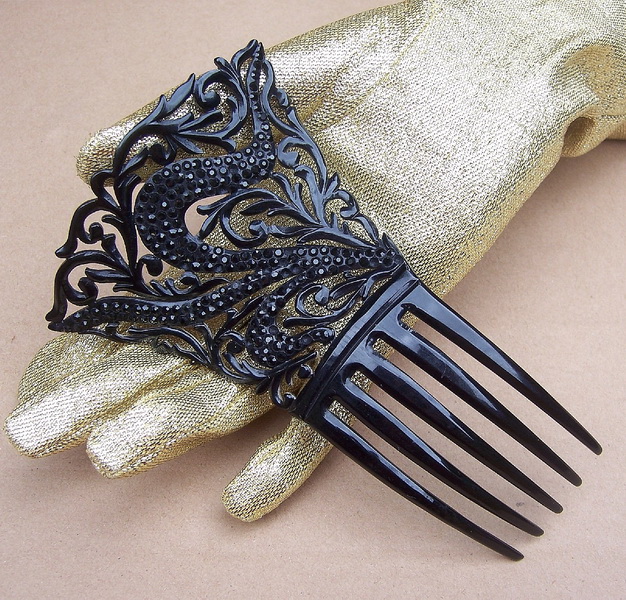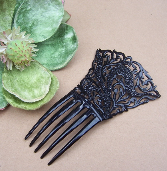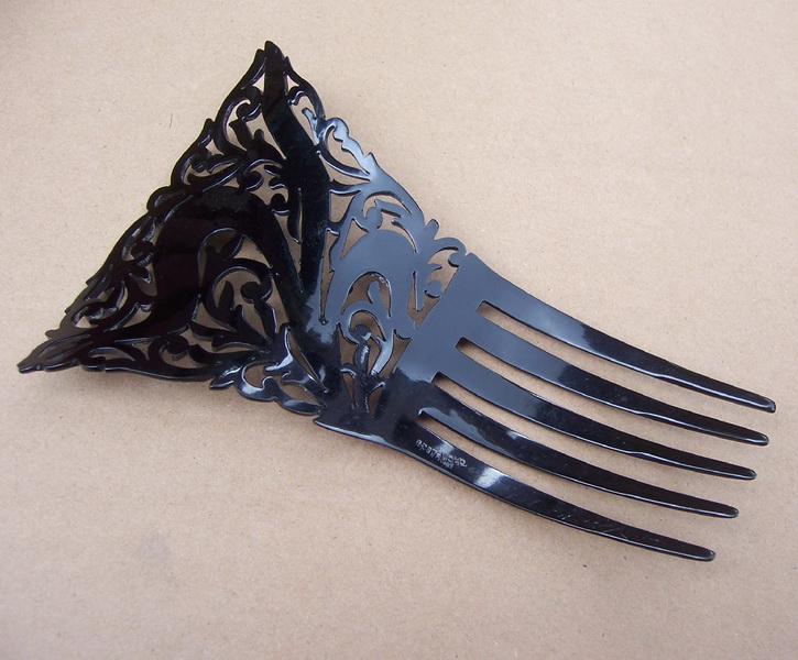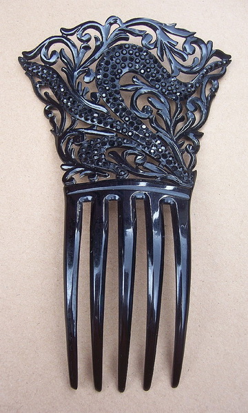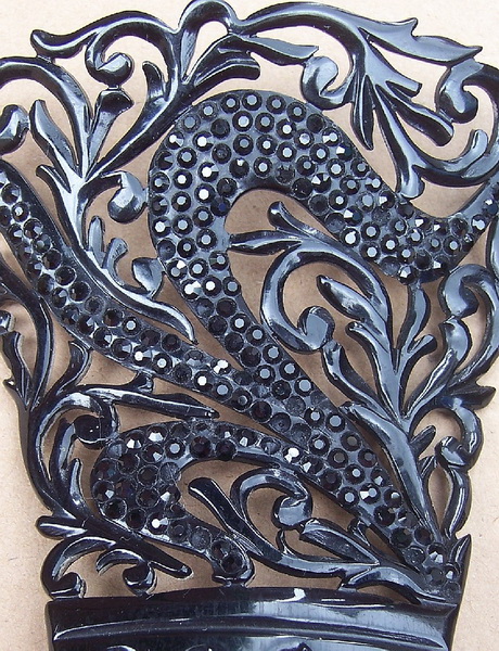 This handsome comb may well have  been worn for mourning, which was an important social custom in the Victorian  and Edwardian eras. Etiquette forbad any personal ornaments save those from  dull dark colours. The material of choice was Whitby jet, but French jet, dyed horn and  black celluloid were also used.