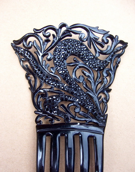 French jet is a glittering form of black glass which has  nothing to do with France,  but was produced mainly in Bohemia,  now part of modern Czechoslovakia,  in the late 19th and early 20th century when it was  extremely popular for jewellery making. In this comb it is incorporated in the  form of black “rhinestones” which are set into a frame of black celluloid. The  beautiful asymmetric design has a lively sense of movement and shows some Art  Nouveau influence.