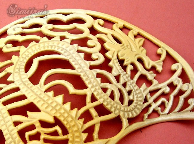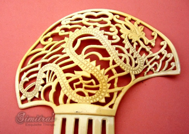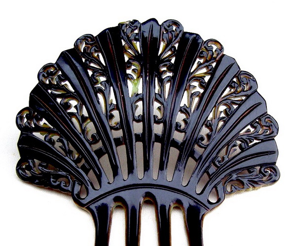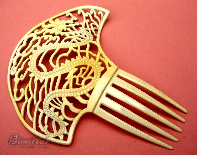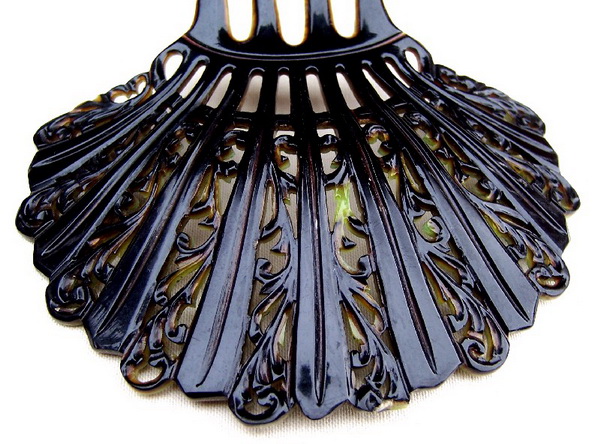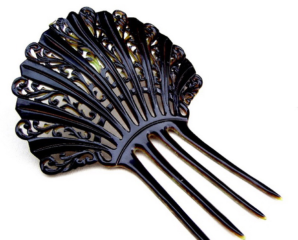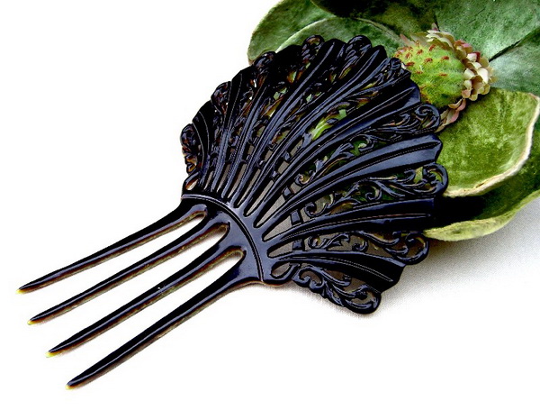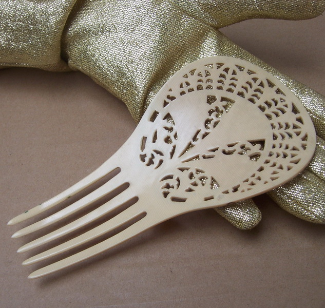 This unusual comb and very beautiful hair comb is an excellent example of  how the Egyptian Revival movement was interpreted for the popular taste. The  base material is French ivory with a tall oval heading supporting. The central  panel incorporates the iconic sunray motif, in which blade like shapes arise  from the base and radiate outwards. This is surrounded by a deep border with  graduated arch shapes.
