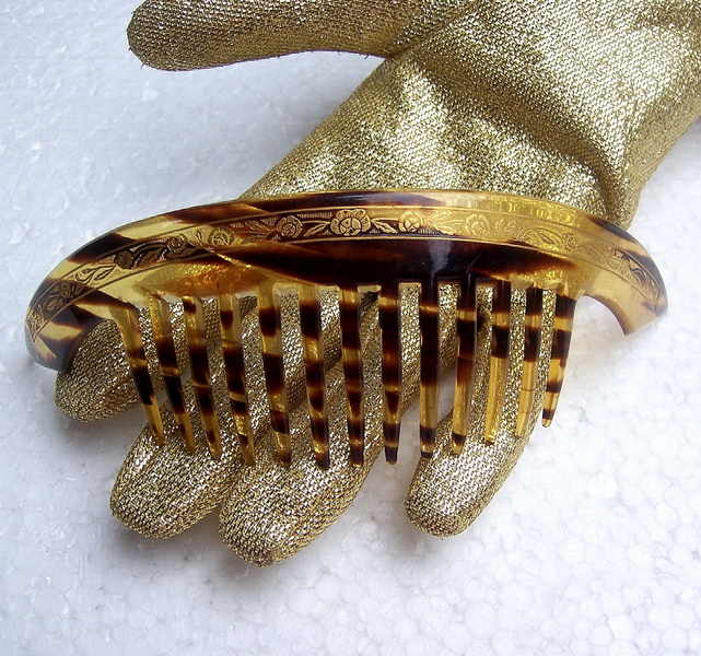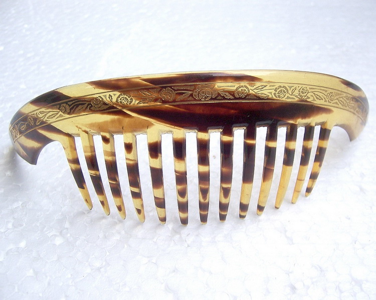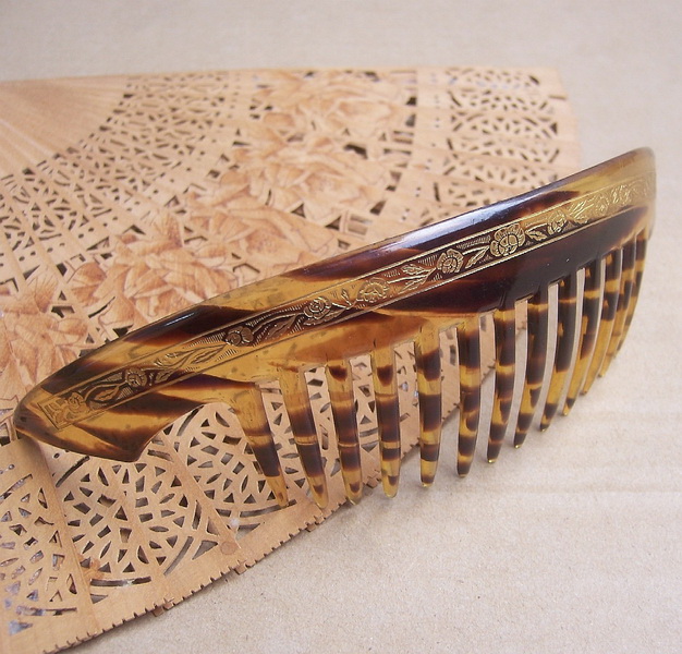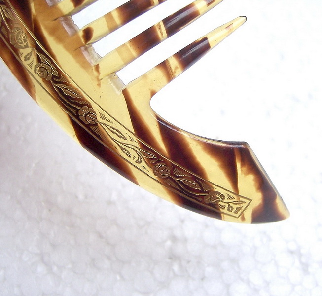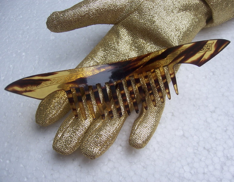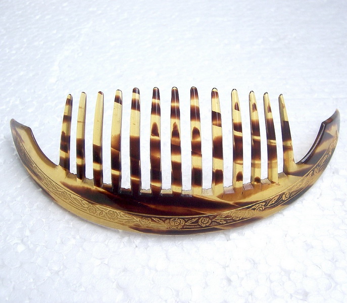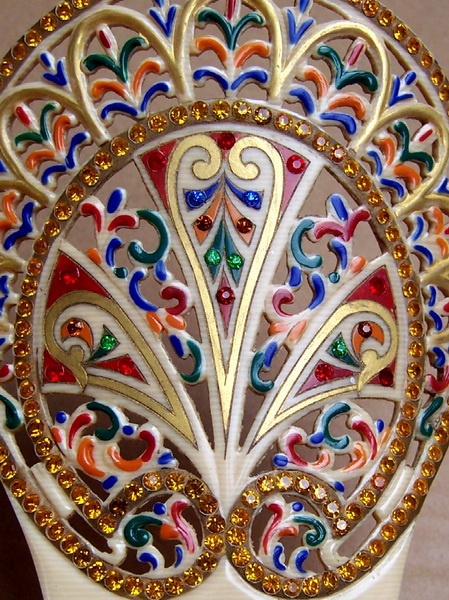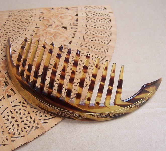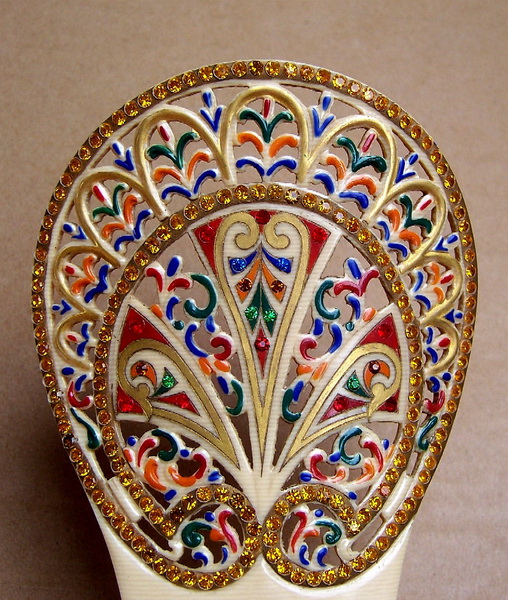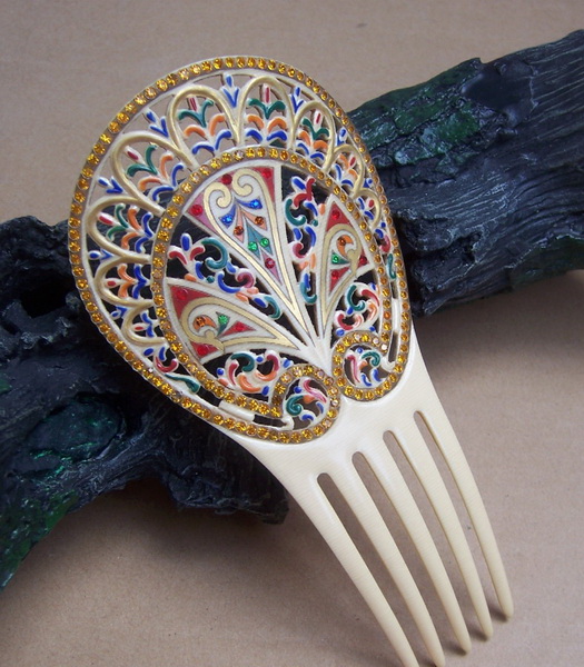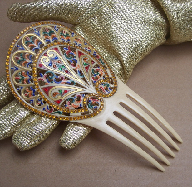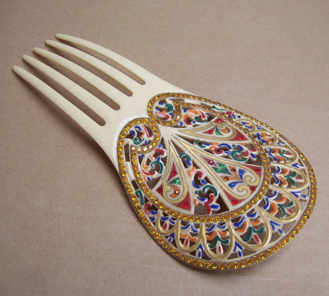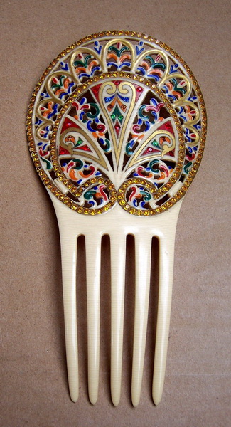 The surface of the comb is decorated in red, blue orange and green enamel  combined with gilding. This brilliant effect is further enriched with  rhinestones in blue, green red and amber. The colours used – deep blue, red,  dark green and gold, are typical of ancient Egyptian tomb paintings and give  the comb its Egyptian look.