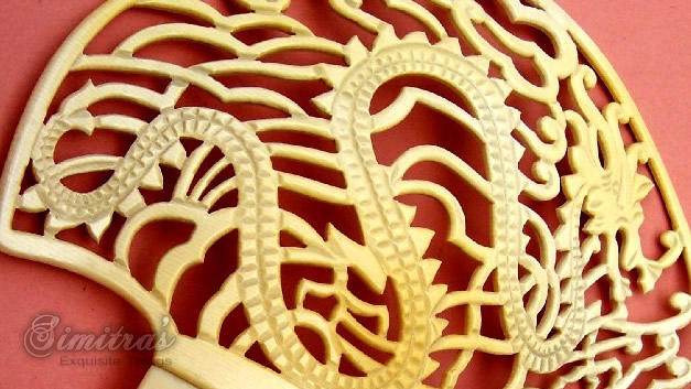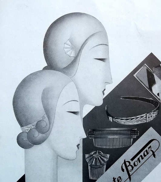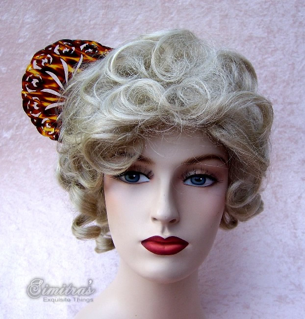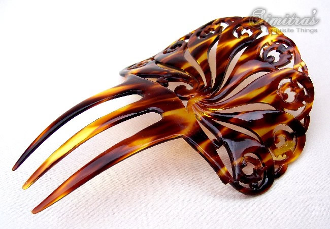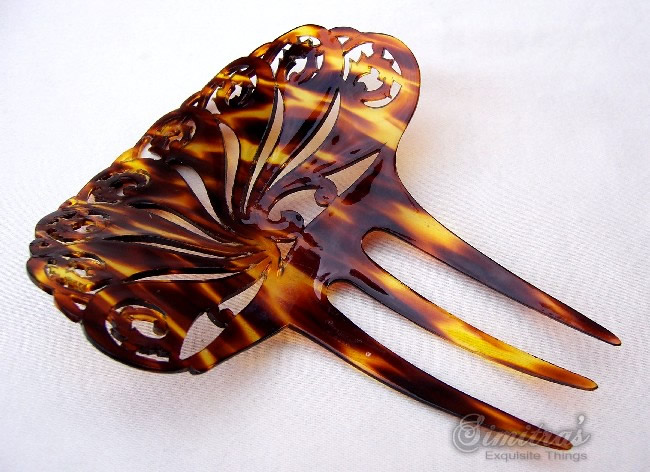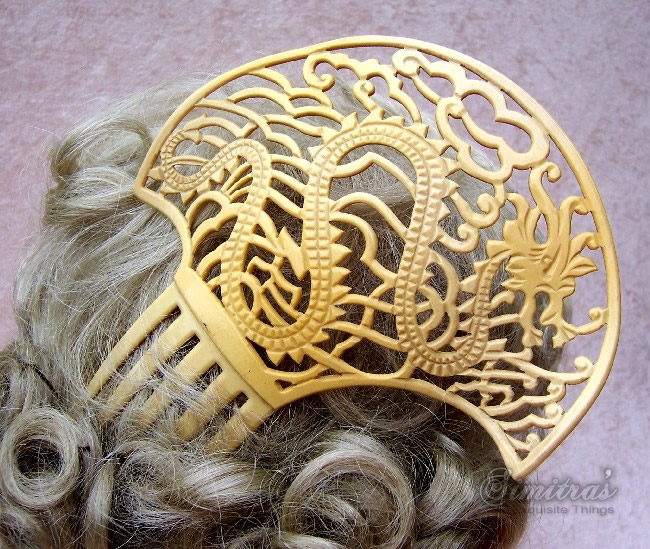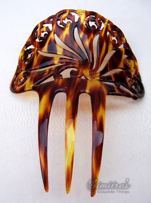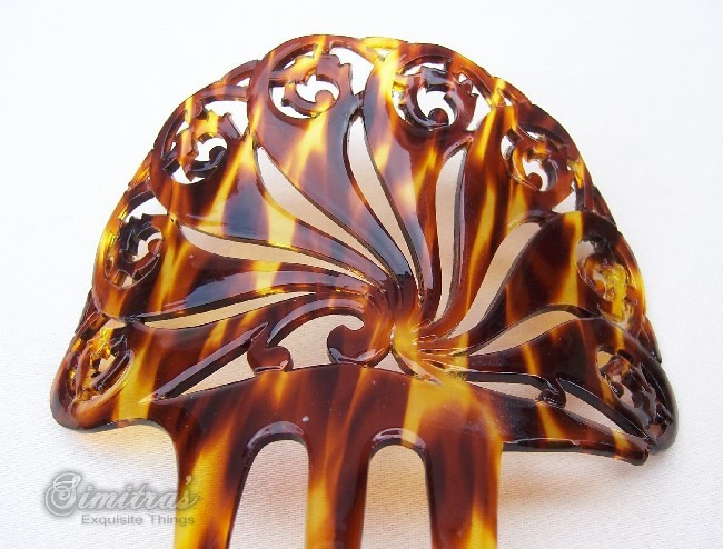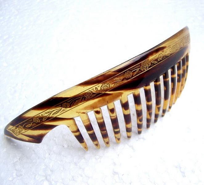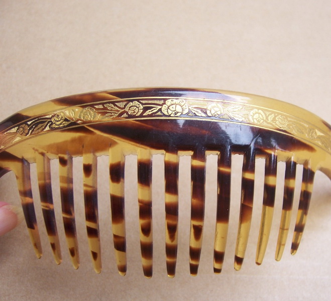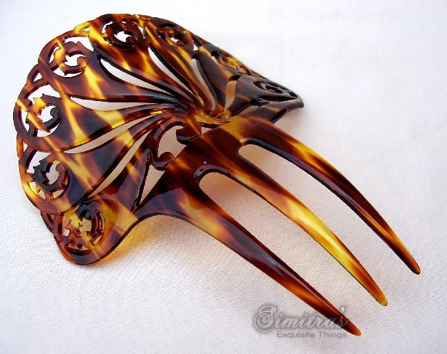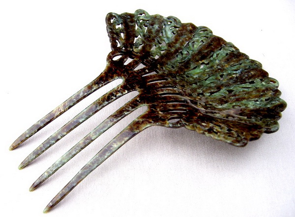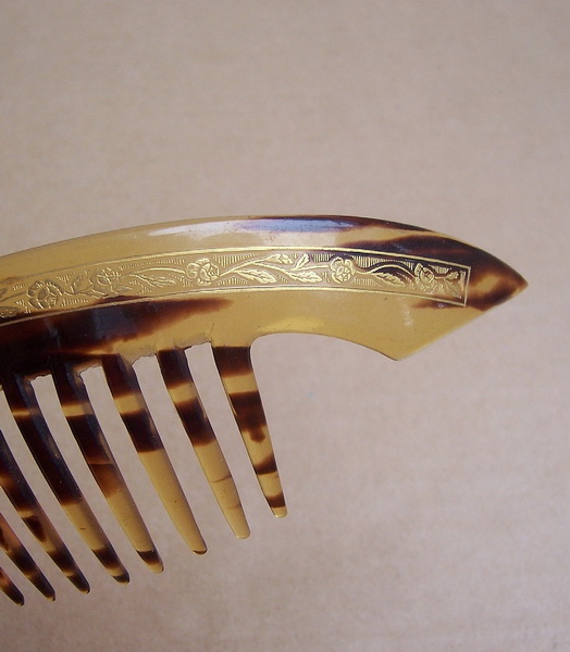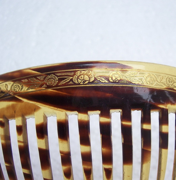 The surface of the comb is decorated in red, blue orange and green enamel  combined with gilding. This brilliant effect is further enriched with  rhinestones in blue, green red and amber. The colours used – deep blue, red,  dark green and gold, are typical of ancient Egyptian tomb paintings and give  the comb its Egyptian look.