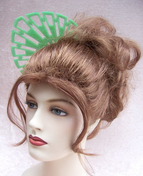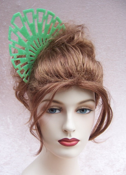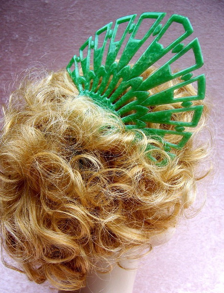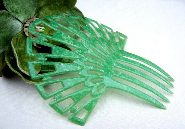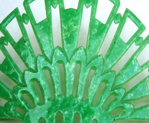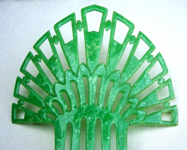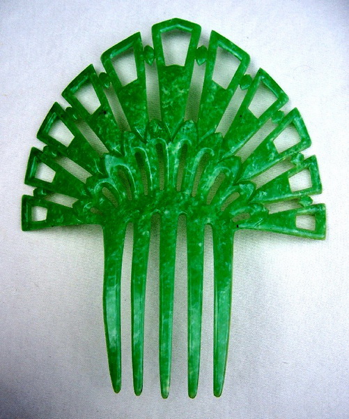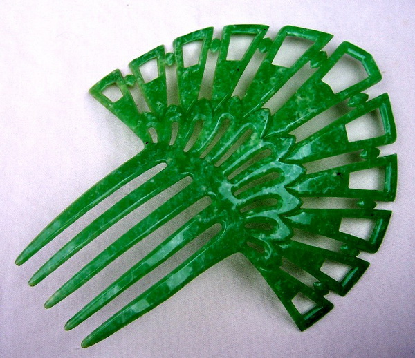 This very  beautiful comb has random mottling to simulate the appearance of oriental jade  and is made in yet another variation of the iconic sunray design.