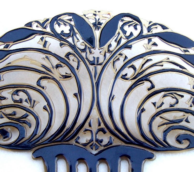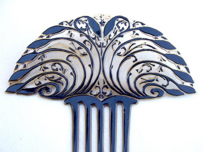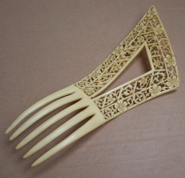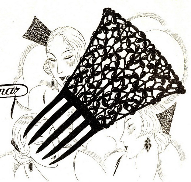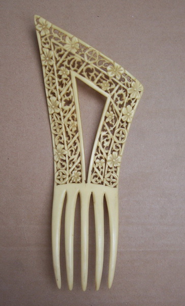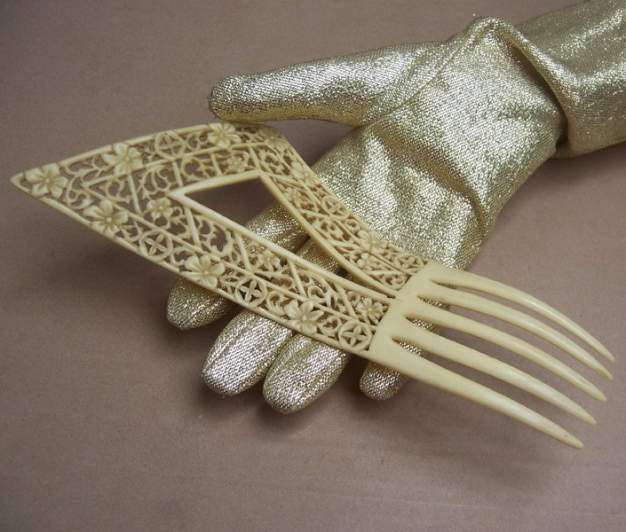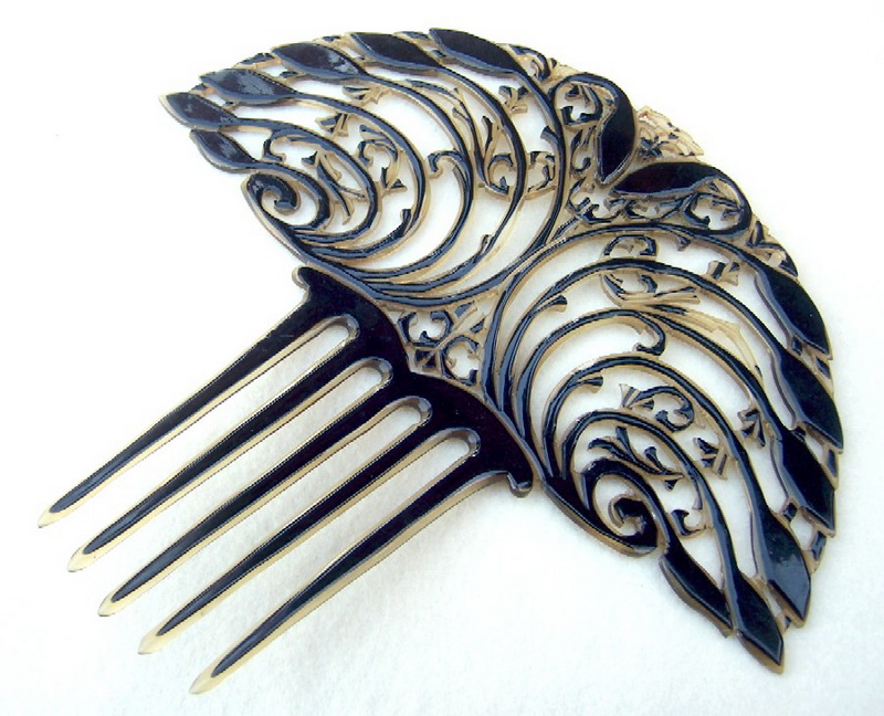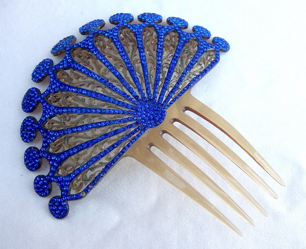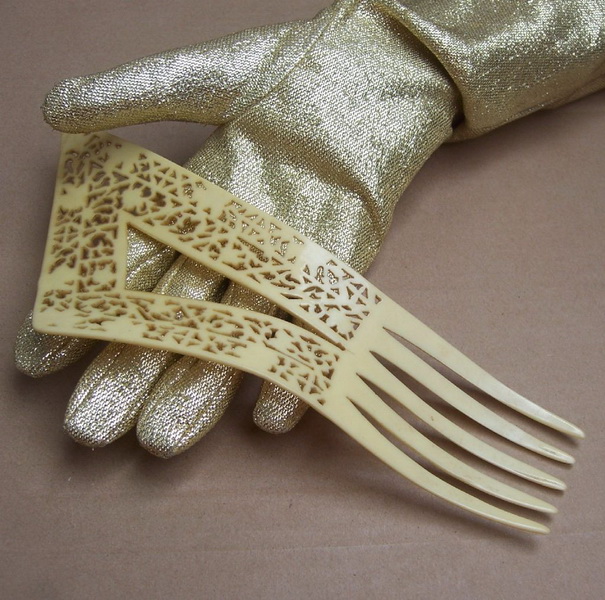 Combs like this were worn as shown in the final  picture which is taken from a contemporary magazine advertisement 1920s. We can  see that the female models are wearing combs with similar high headings. The  ornaments are typically placed standing proud of the head and at an acute angle  so that the beauty of the design was visible from all angles.
