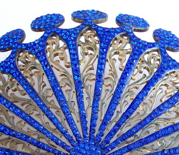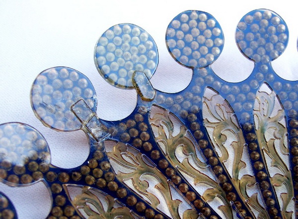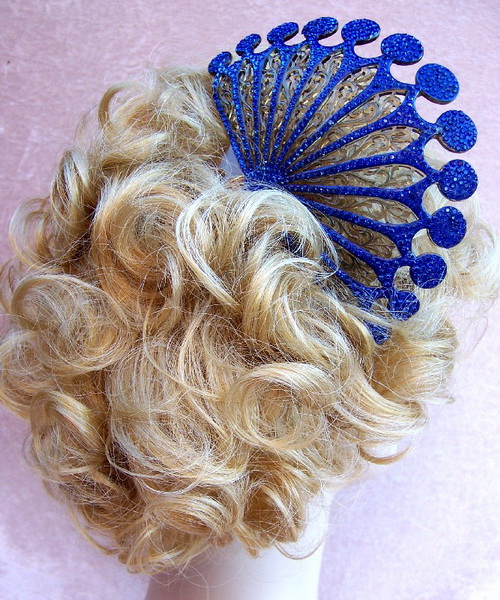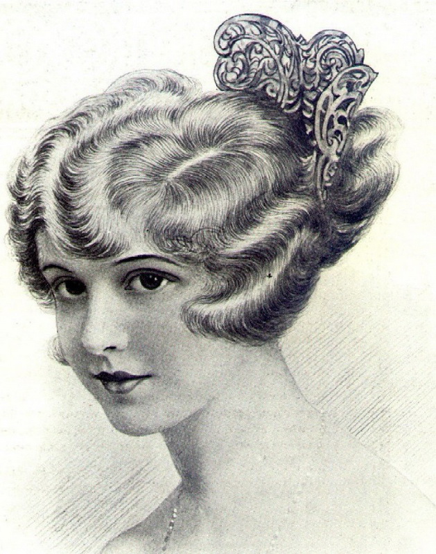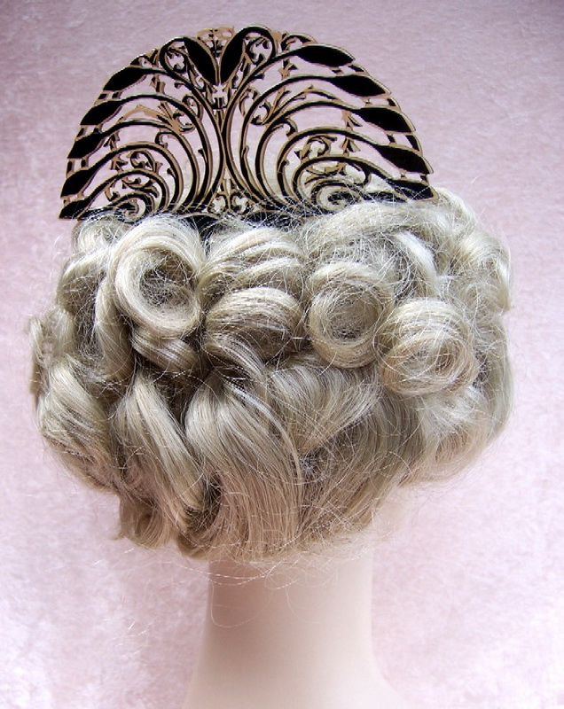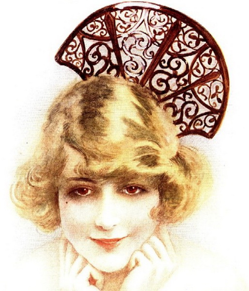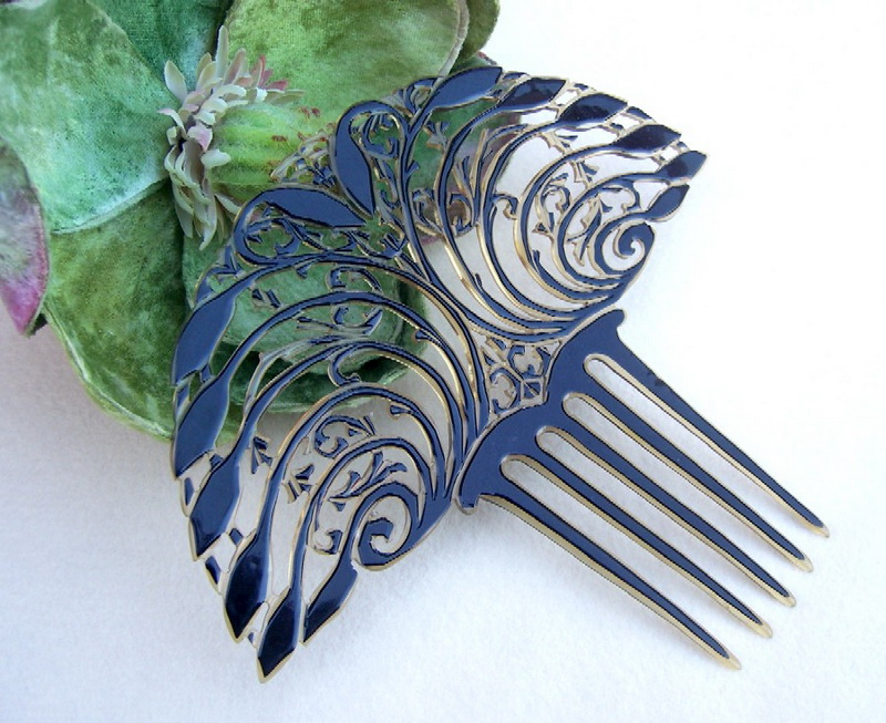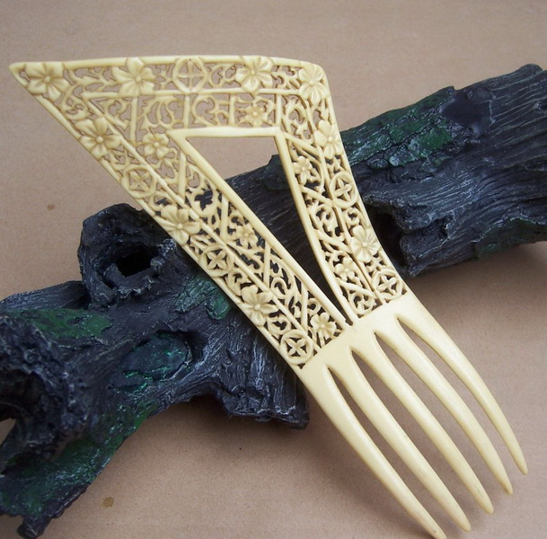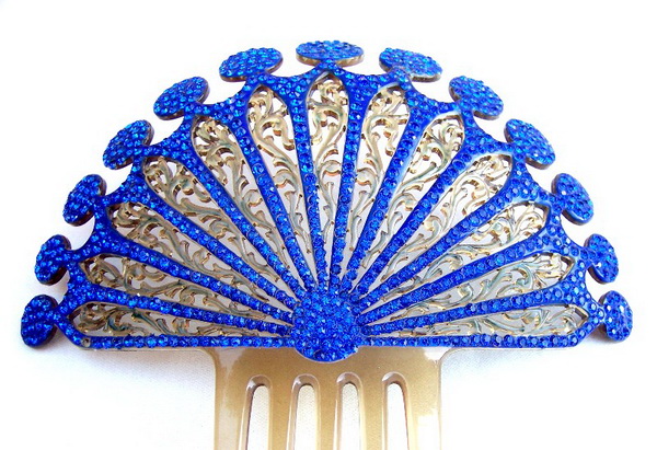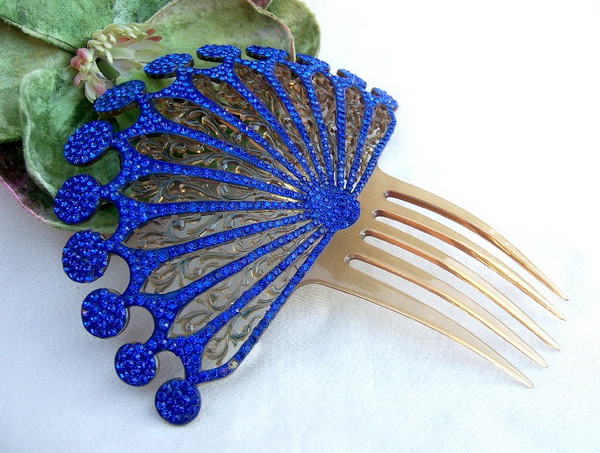 Combs like this were worn as shown in the final  picture which is taken from a contemporary magazine advertisement 1920s. We can  see that the female models are wearing combs with similar high headings. The  ornaments are typically placed standing proud of the head and at an acute angle  so that the beauty of the design was visible from all angles.