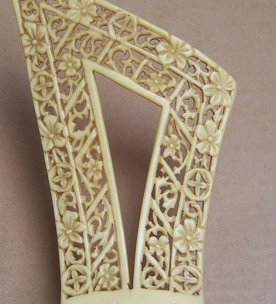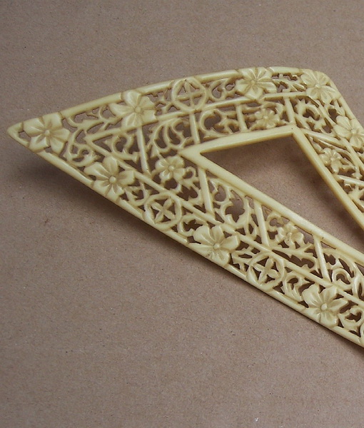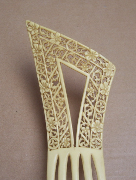 This spectacular and very large comb is made from ivory coloured celluloid  which is sometimes called French ivory. The heading is a very tall asymmetric  wedge shape, inclined to the left. In the centre is an openwork panel  surrounded by a double border of floral motifs. The comb has a very strong  geometric feel despite the use of these naturalistic motifs, which reveal some  lingering Art Nouveau influence.