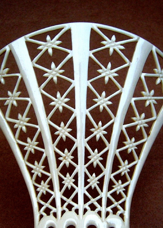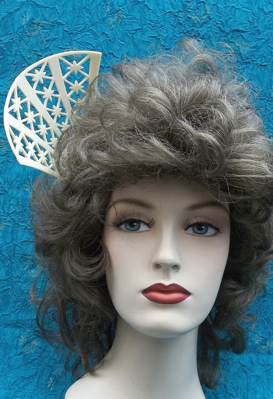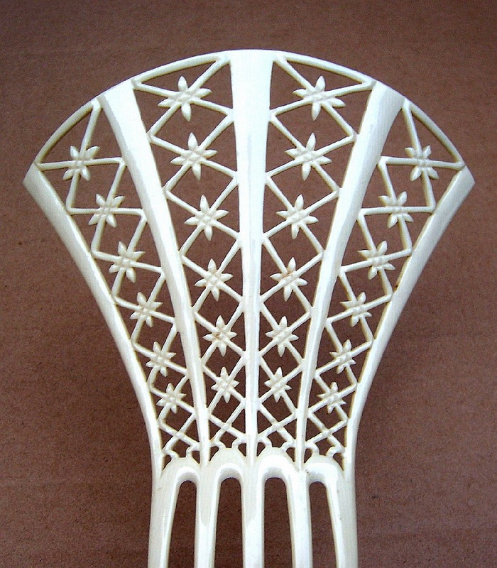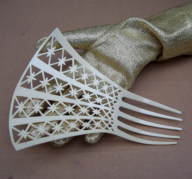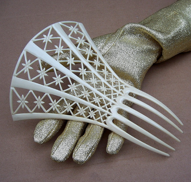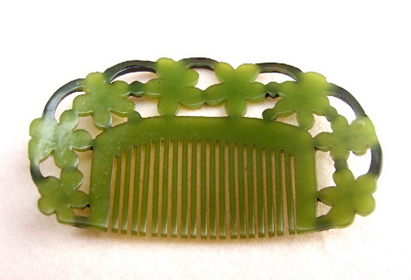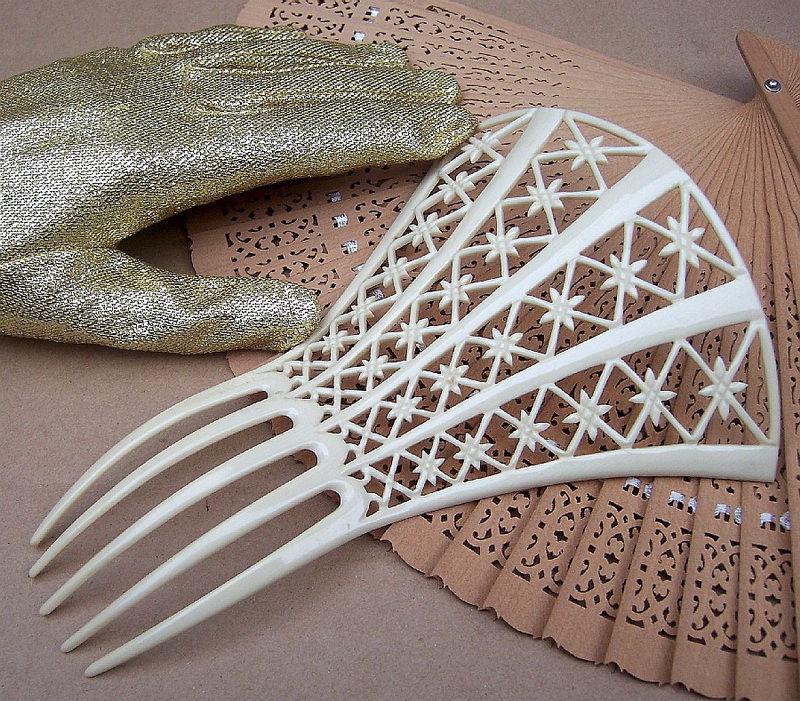 This one is made in ivory coloured celluloid having a pretty star or possibly flower motif placed against trellis work. The treatment of the flowers and their placement against a latticework background reveals some Chinese influence. Art Deco was an eclectic style which derives influences from many cultures, including the Orient. The comb is therefore intended to be a synthetic ivory substitute.