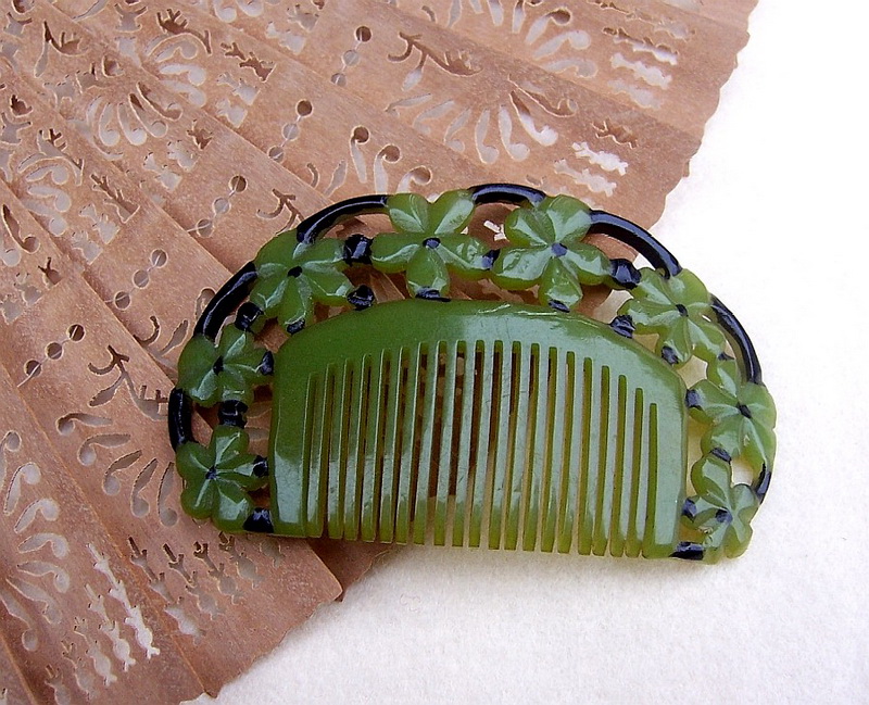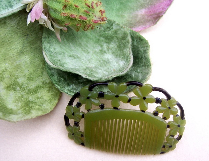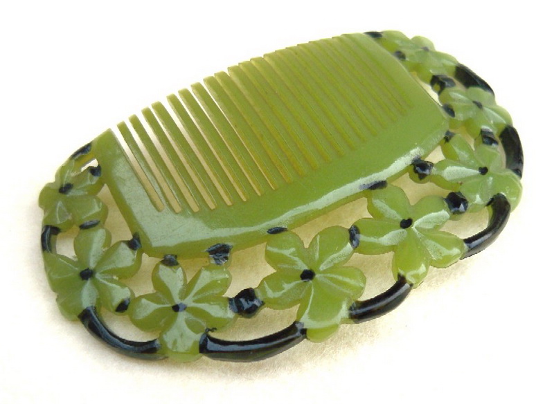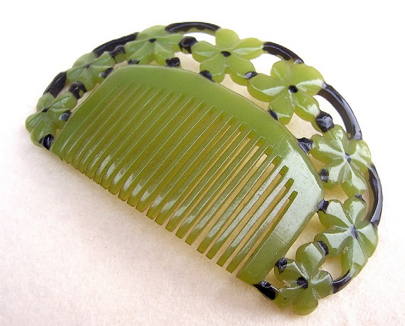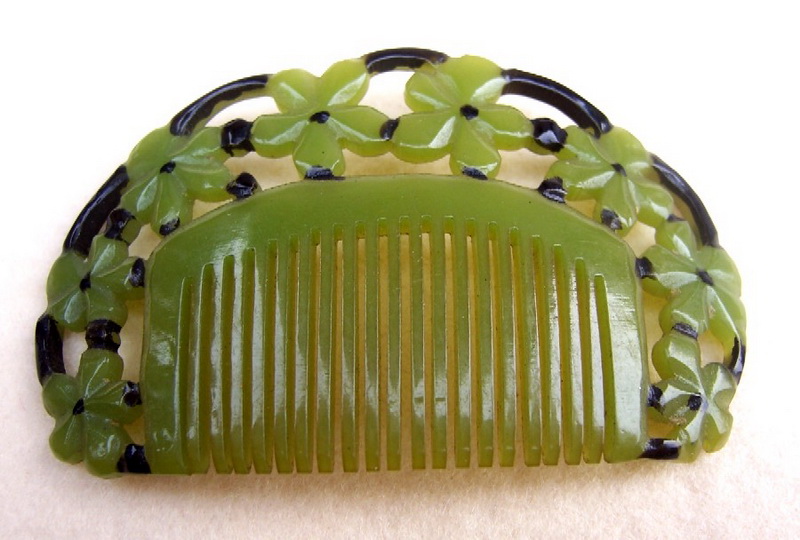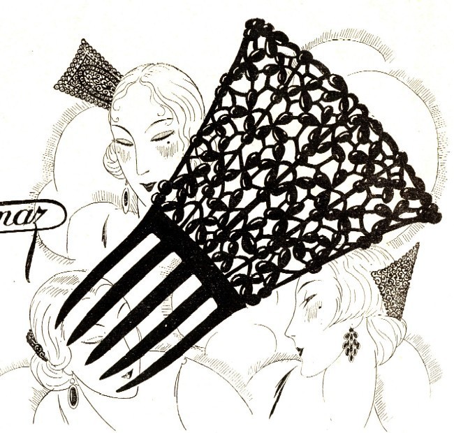 Hair combs from the late 1920s and 1930s are comparatively rare, because comparatively few were produced. The boyish shingle, which came into vogue about 1925, sounded the death knell of hair combs as a widely fashionable hair accessory, and they no longer appear in fashion magazines after this date. However, by 1930 many women were again growing their hair, and the fashion writers and hairdressing fraternity were making strenuous efforts to re-introduce the use of hair ornaments.  In this they had some partial success, but few hair accessories as such were produced. Those that do appear are usually small and rather modest.