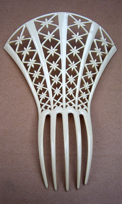This ornament is a variation of the Spanish or mantilla comb because it resembles the traditional tortoiseshell ornaments worn by Spanish ladies with their native dress. The production of the opera Carmen led to a fashion for high Spanish style combs in the 1870s. They remained fashionable throughout the late Victorian and Edwardian periods, and into the 1920s.