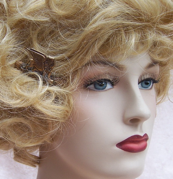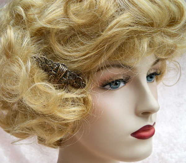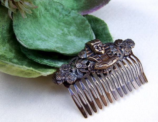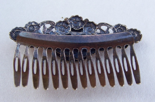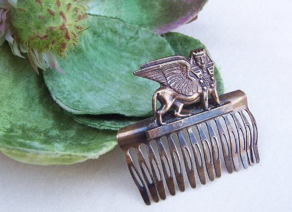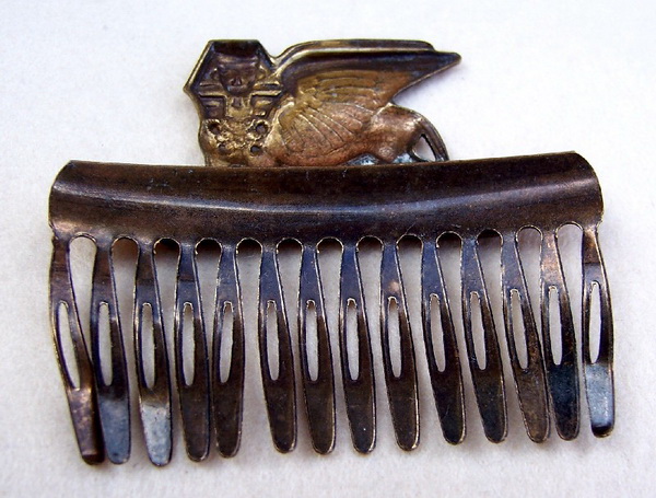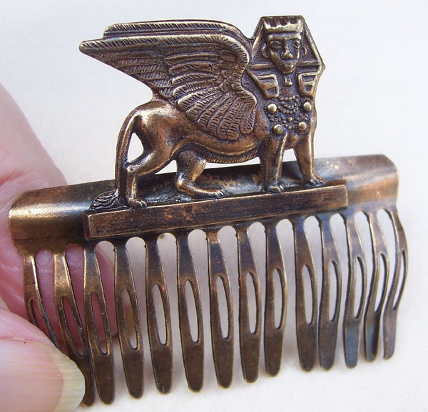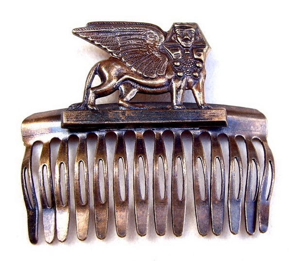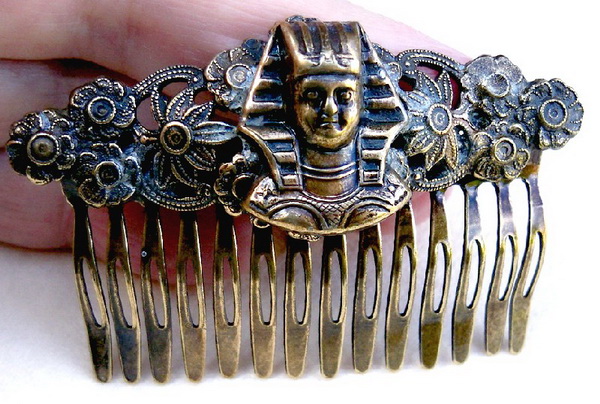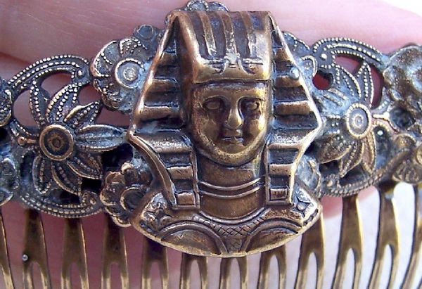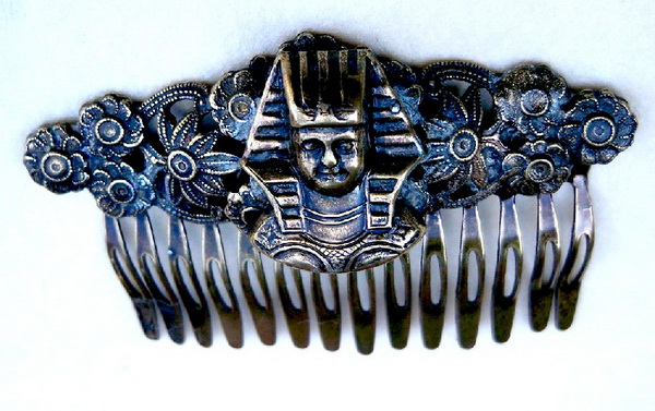 This is an interesting example of a personal ornament inspired by a blockbuster movie. In 1965 the film Cleopatra starring was one of the most expensive and controversial ever made. Starring the then still young and beautiful Elizabeth Taylor as the siren of the Nile it inspired a widespread fashion for hairdressing and jewellery in the Egyptian style. This little side comb is made entirely in antiqued metal and features the head of a pharaoh presented amid a background of flowers.